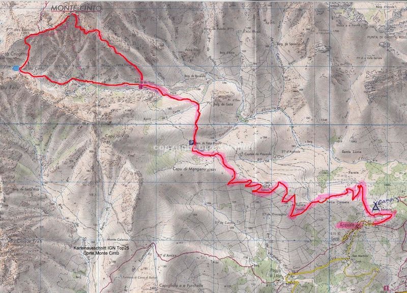 Monte Cinto Die Anreise erfolgt von Porto über Evisa nach Calacuccia. Oberhalb dieses grössten Ortes des Niolu liegt das Bergnest Lozzi . Die am Ende der noch einigermassen befahrbaren Strasse auf 1080 M.ü.M. liegenden zwei Zeltplätze, sind Ausgangsort für den etwa fünf- bis sechsstündigen Aufstieg auf den Mt. Cinto. Empfehlenswert ist eine Übernachtung im Raume Calacuccia, Albertacce oder Lozzi. Eine rechtzeitige Anreise ist zu Empfehlen, da die Logierplätze relativ rar sein können. Vor Tagesanbruch sollte der Aufstieg ab dem Zeltplatz in Angriff genommen werden. Über die Bergerie de Petra Pinzutu erreicht man das Refuge de l'Erco auf 1667M.ü.M. Rechtwinklig zum Bach d'Erco erreicht man nach ca. 200m den Einstieg in die SE-Flanke zum Mt. Cinto. Ab hier ist die Route nur noch geübten Berggängern zu empfehlen - noch ca. 3 Std. bis zum Gipfel. Belohnt wird man mit einem überwältigenden Ausblick über die West -, zur Nord - bis hin zur Ostküste. Der Abstieg erfolgt über denselben Weg retour zur Erco - Hütte. Eine andere, anstrengendere Variante ist: Von der Erco - Hütte folgt man dem Weg zum Lac du Cinto. Schon bald ist kein rechter Pfad mehr vorhanden und die Suche nach einer geeigneten Route hin zum See geht los. Unter Auswahl zwischen Dutzenden von Steinmännchen erreicht man den tiefblauen Lac du Cinto. Von dort kämpft man sich durch eine riesen Geröllhalde zum Pnte. des Eboulis auf 2607 M.ü.M. Da folgt man einem mit roten Punkten mehr oder weniger markierten Weg zum Mt. Cinto. Der Abstieg ist auch über die SE-Flanke möglich . Routenbeschreibung und Fotos Mt.Cinto von R.Muff. Besten Dank Werni Copyright © 2006 [wernermuff]. Alle Rechte vorbehalten.
